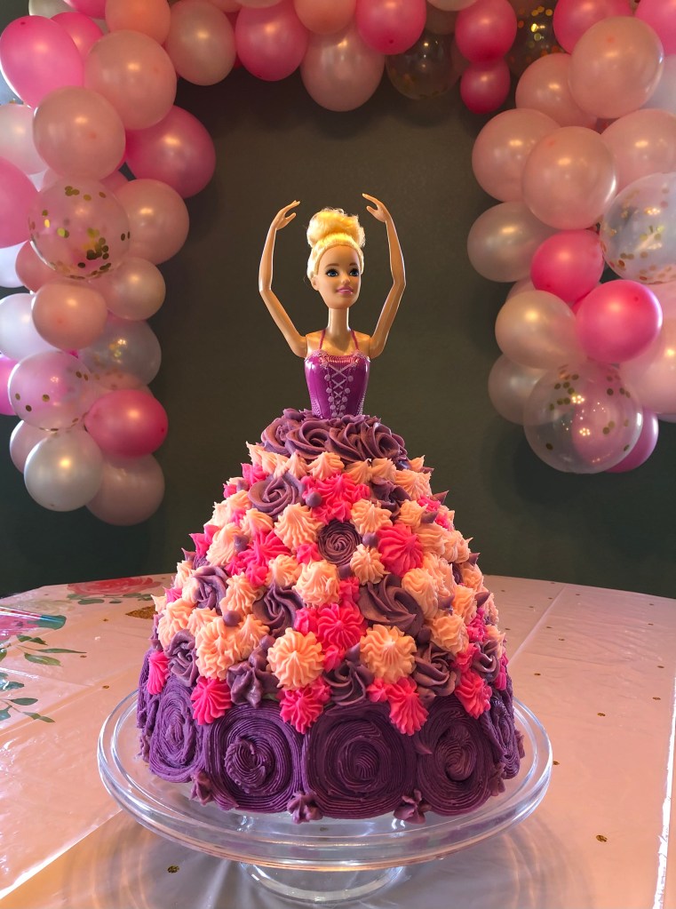 I needed a doll with clothes printed on her so I wouldn’t have to give her a frosting bustier or ruin her clothes with icing, and the one that fit the bill was a ballerina on Amazon. Which brings me to my lifelong gripe that Barbie’s measurements are ABSURD and thus required five layers of cake just get to the bottom of her butt. A sixth layer would have made the dress tall enough but really narrow (my cake pans are 8in) so I used five with a little extra frosting to cover her tush.