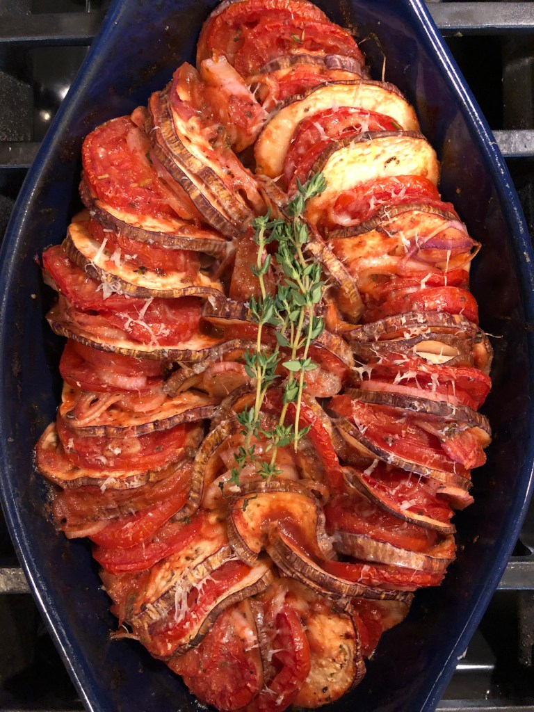 Last night’s ratatouille. I took the boys to the grocery store for the first time since the pandemic started and it was so overwhelming for all of us I forgot the zucchini, so this is just tomatoes, shallots, and eggplant. Oops.