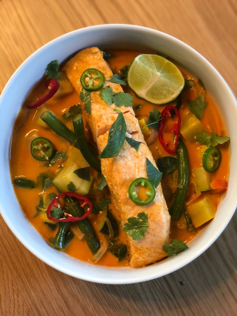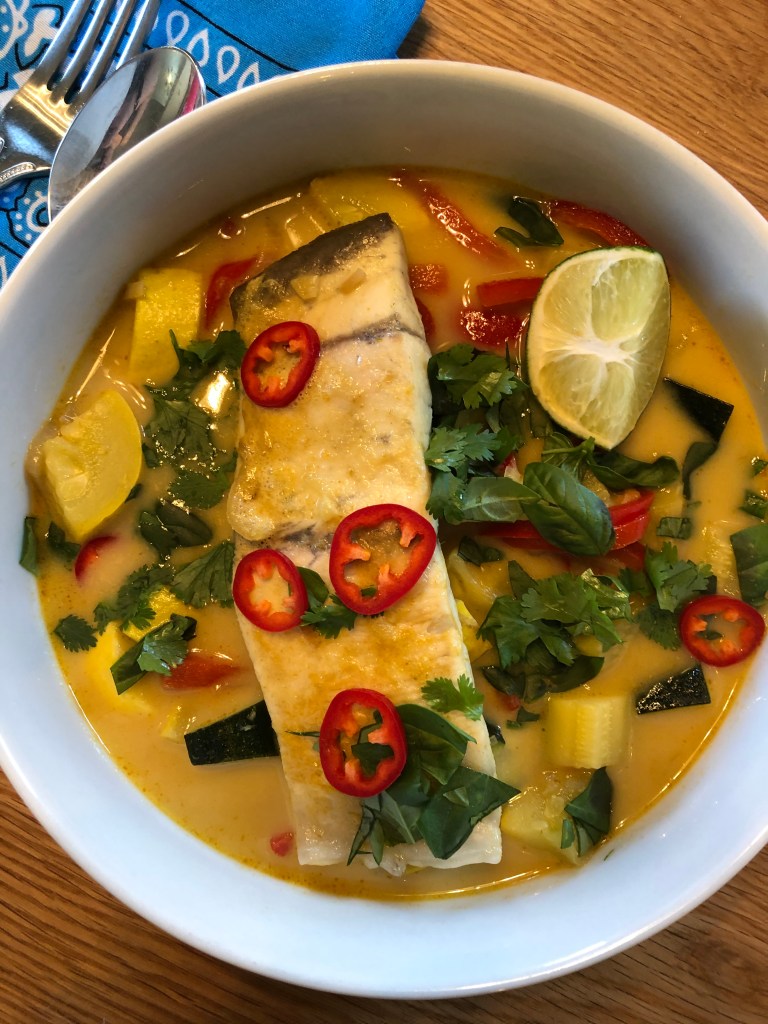 - When your fish is cooked (poke with fork or knife and twist — if it flakes easily it’s cooked), serve the soup in wide bowls with the fish on top. I topped mine with thin slices of Fresno chile, a lime wedge, cilantro, and basil. Peanuts would also be a great topping!