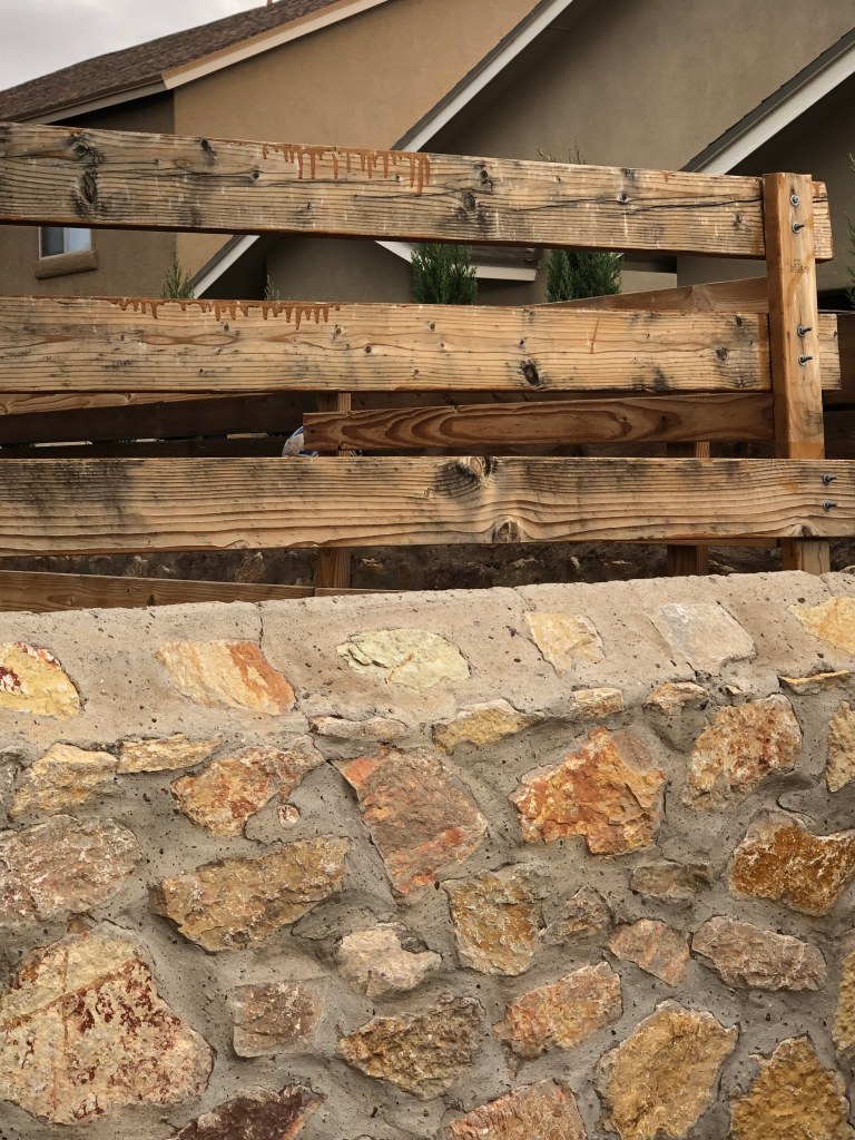 The neighborhoods in our area do not have a Home Owners Association, which means that you don’t need permission to do anything to your property, which is fantastic, but it also means your neighbors can rig up an uneven fence above their rock wall so that we see drips of outdoor stain and exposed nails. The only rule out here is that you can’t raise the rock wall above four feet, but you can build any other kind of fence on top of it you want. Lots of people have interior fences of engineered wood or iron, and some have wood that looks like crap.