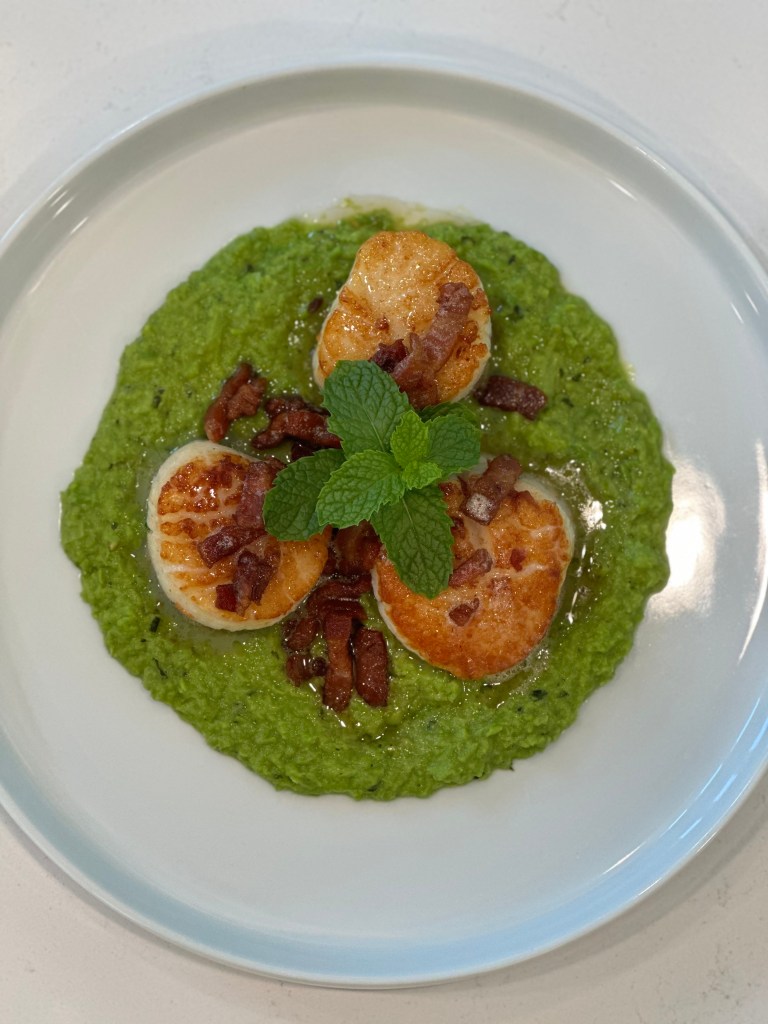 I’ve seen chefs sear in stainless steel but I’m always worried whatever I’m cooking will stick and ruin the meal, but it turns out if you trust the maillard reaction, it will lift. Natural sugars in your food release, brown, and crisp, and then your protein will unstick from the pan so you can flip it. If it feels stuck, don’t force it, it’s not ready. I seared my scallops and then basted them in brown butter and lardon. My mint plant is growing like crazy so I made a puree of peas, leeks, and mint to serve with my scallops. Out of everything I made this week, this dish might have been my favorite.