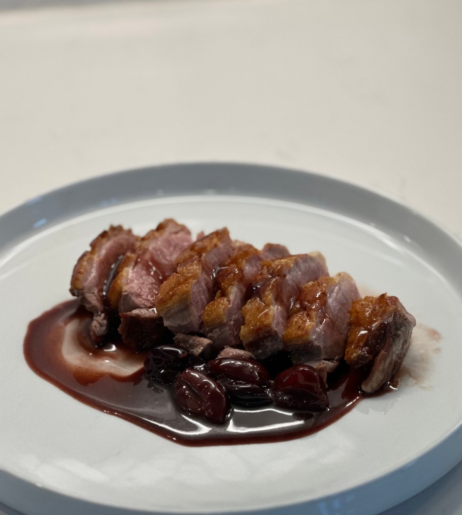 Today was the culmination of several days of prep. Earlier in the week I made browned broth from beef neck bones and aromatics, some of which I reduced to a concentrated stock. I reduced port down to a thick syrup. I simmered cherries in a honey syrup. All three sauces were combined and reduced further with a slurry, and finished with cold butter to give it shine. I was so proud of this sauce, but holy shit French recipes are fussy. I served my port and cherry reduction over seared duck breast. Plating was a mess because I was so excited to be finished and taste it after days of work. It was divine.